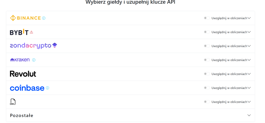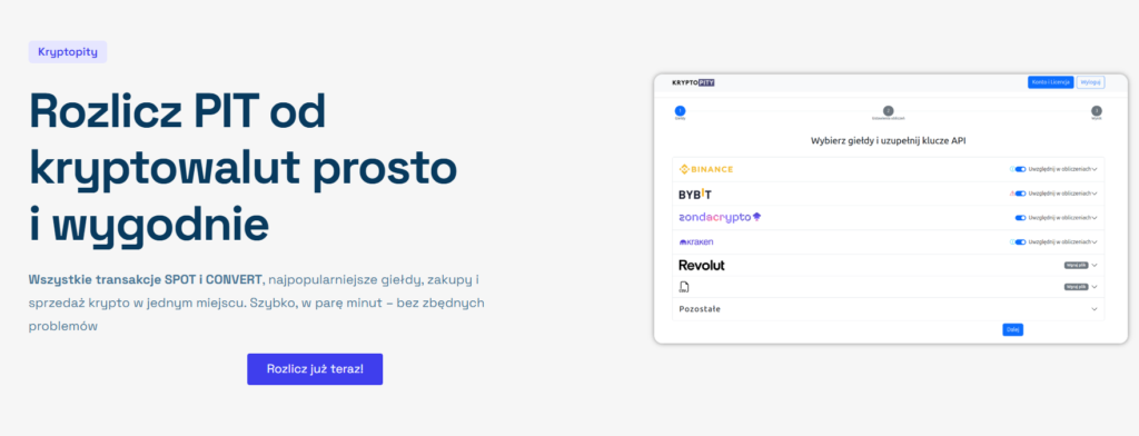 Zacznijmy od konkretów. Kryptopity.pl w bieżącym sezonie rozliczeniowym obsługują pięć najpopularniejszych giełd oraz jedną świeżą integrację:
