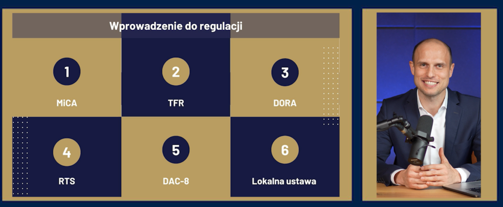 Największą zaletą tego kursu jest to, że nie zatrzymuje się na definicjach. Oczywiście dostajesz uporządkowane wprowadzenie do MiCA, RTS, TFR i ich wzajemnych zależności, ale sens tego programu polega na czymś więcej. Chodzi o to, żebyś po przejściu materiału rozumiał nie tylko treść regulacji, ale też potrafił z niej korzystać w praktyce. Szkolenie można podzielić tematycznie, dowiesz się m.in.: